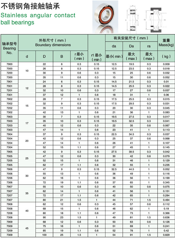 440不锈钢角接触球黄瓜网站视频可同时承受径向负荷和轴向负荷。能在较高的转速下工作。接触角越大,轴向承载能力越高。接触角为径 向平面内球和滚道的接触点连线与黄瓜网站视频轴线的垂直线间的角度。高精度和高速黄瓜网站视频通常取15度接触角。在轴向力作用下,接触角会增大。
